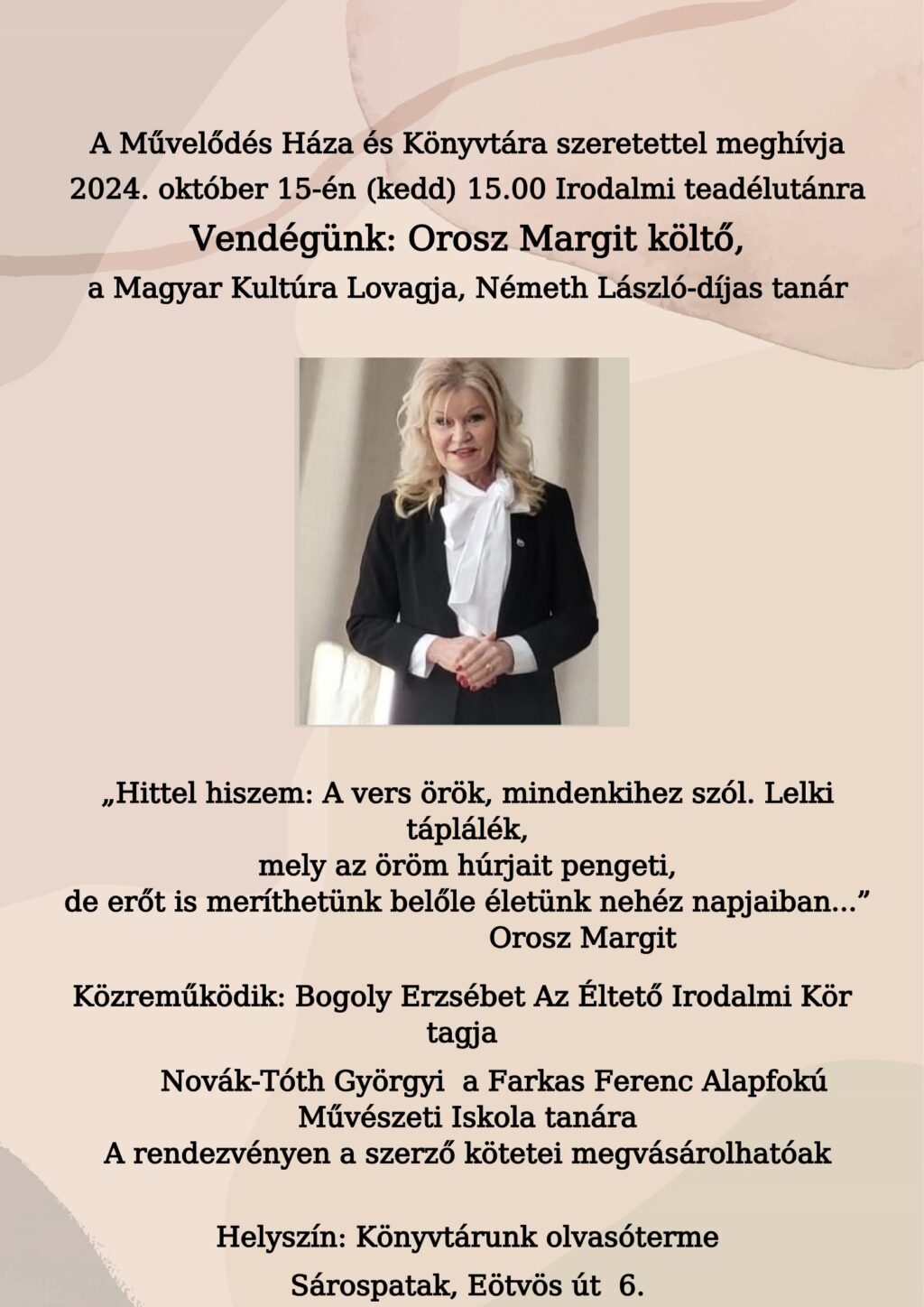 • Meghívó irodalmi teadélutánra: Orosz Margit, költő