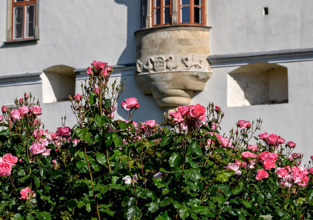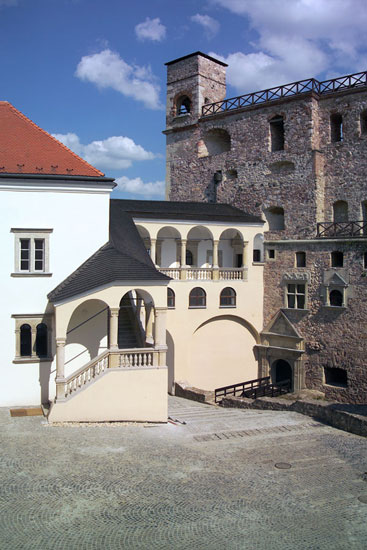 A várudvar különleges részlete a Lorántffy-loggia, a nevét viselő szárny Lorántffy címeres erkélye egykori szobája helyét mutatja.