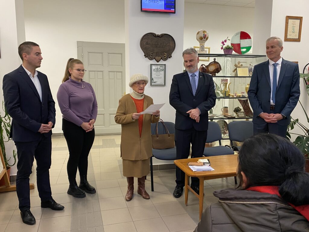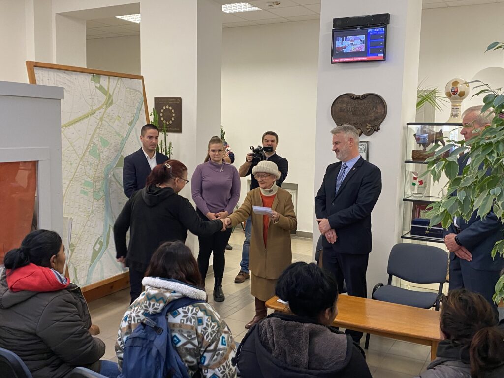 A Polgármesteri Hivatal aulája volt a szeretetteljes esemény helyszíne december ötödikén. Tamás Erzsébet úgy döntött, idén azokat a közmunkásokat támogatja advent idején, akik a mindennapokban a város tisztaságáért felelnek, az utcaseprőket. 12 személy vehetett át Böcike nénitől pénzbeli adományt, mindannyian nagyon hálások voltak egykori tanárnőjüknek.