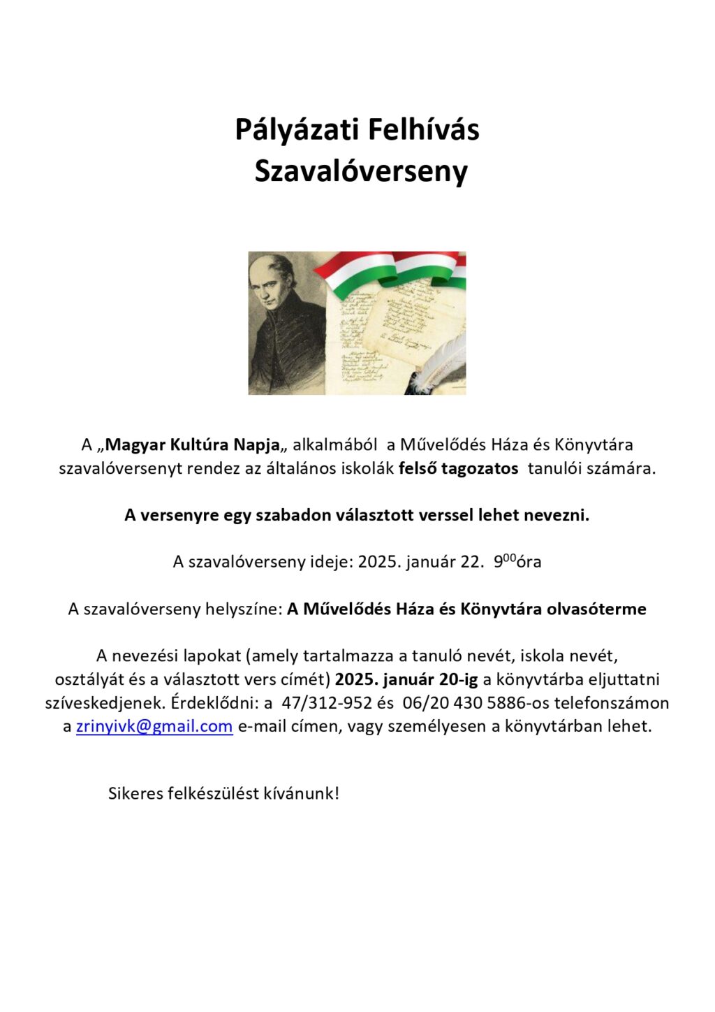 Pályázati Felhívás – Szavalóversenyt szervez a Zrínyi Ilona Városi Könyvtár