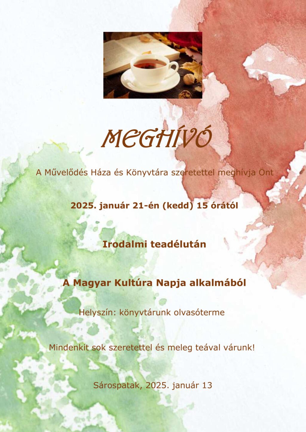 Meghívó-Irodalmi teadélutánra a Magyar Kultúra napjára
