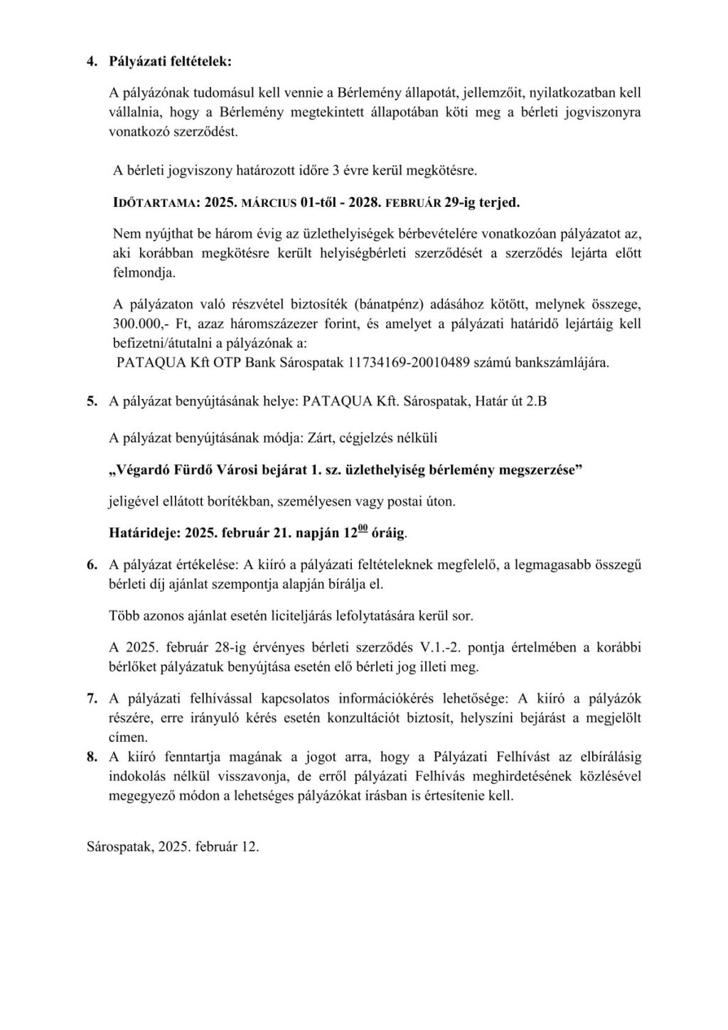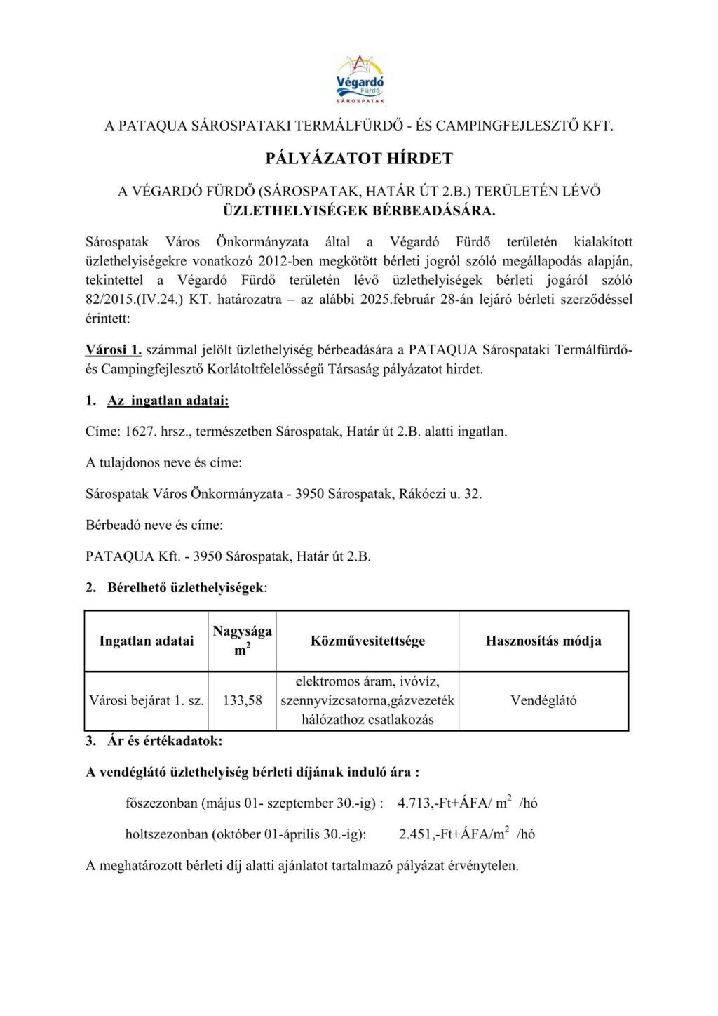 PÁLYÁZAT – üzlethelyiségek bérbeadására ( Végardó fürdő területén )