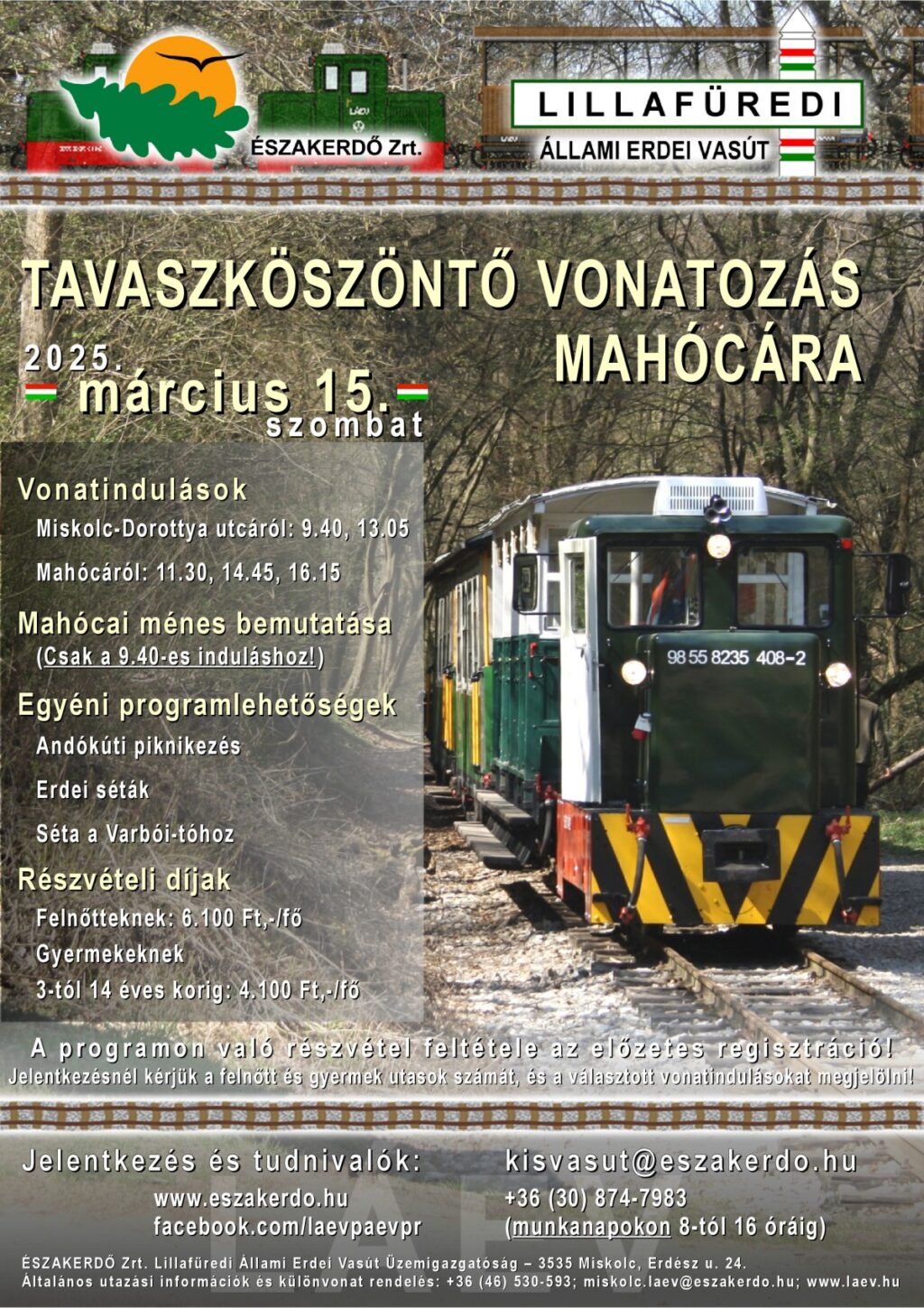 Nemzeti ünnepünkön ismét különvonat indul az ÉSZAKERDŐ Zrt. által üzemeltetett Lillafüredi Állami Erdei Vasút menetrend szerinti vonatok által nem járt Mahócai szárnyvonalára. Az Andókút és Mahóca környéki egyéni kikapcsolódási lehetőségeken túl a 9.40 órakor induló vonat utasai elsétálhatnak a Mahócai Méneshez, megtekinteni Mahóca csodás lovait. A programra előzetes regisztráció szükséges, a kisvasut@eszakerdo.hu e-mail címen.