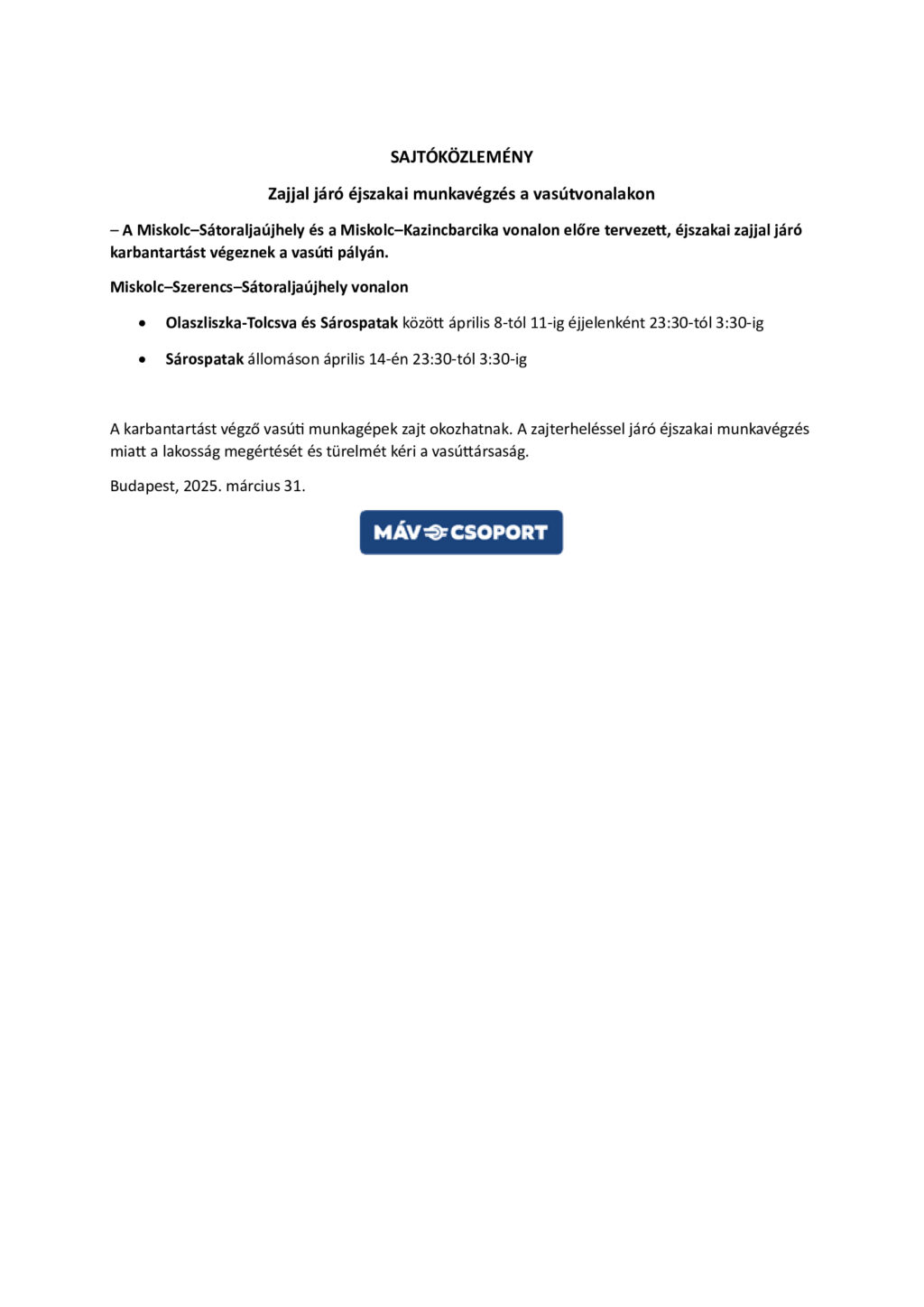 • Zajjal járó éjszakai munkavégzés a vasútvonalakon