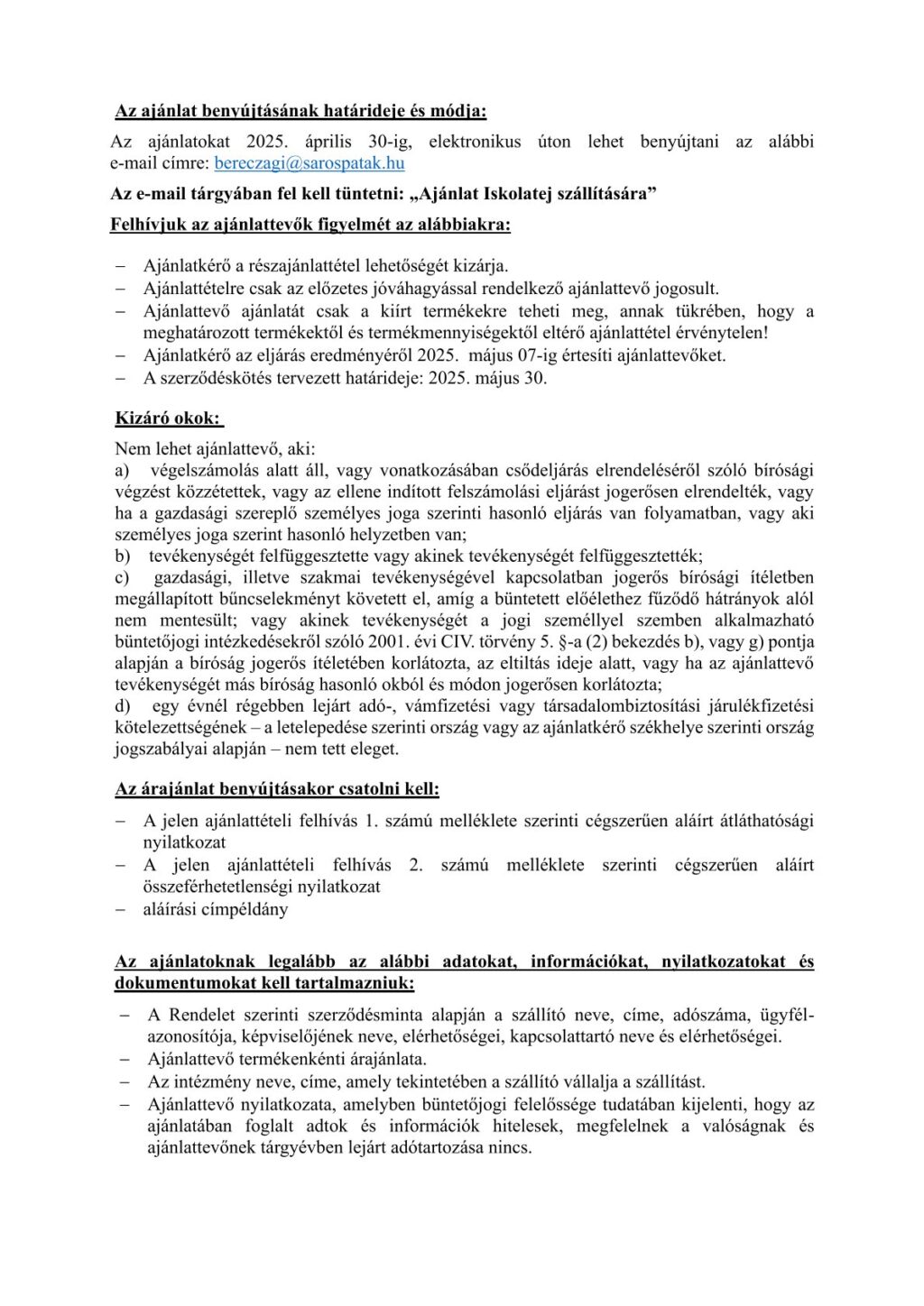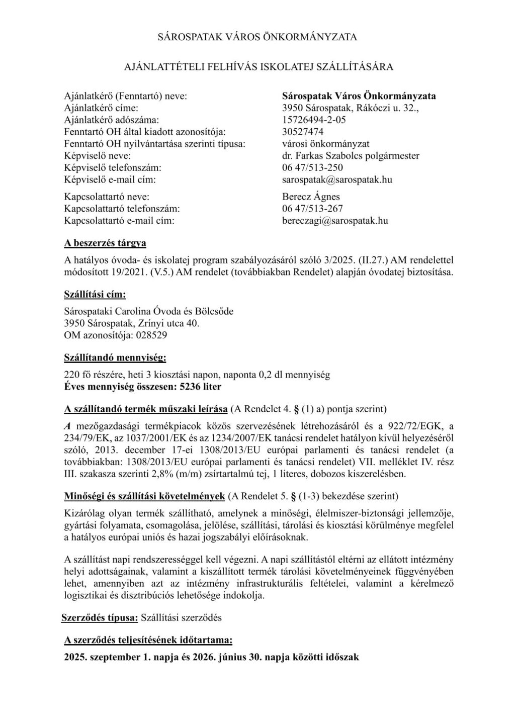 AJÁNLATTÉTELI FELHÍVÁS ISKOLATEJ SZÁLLÍTÁSÁRA