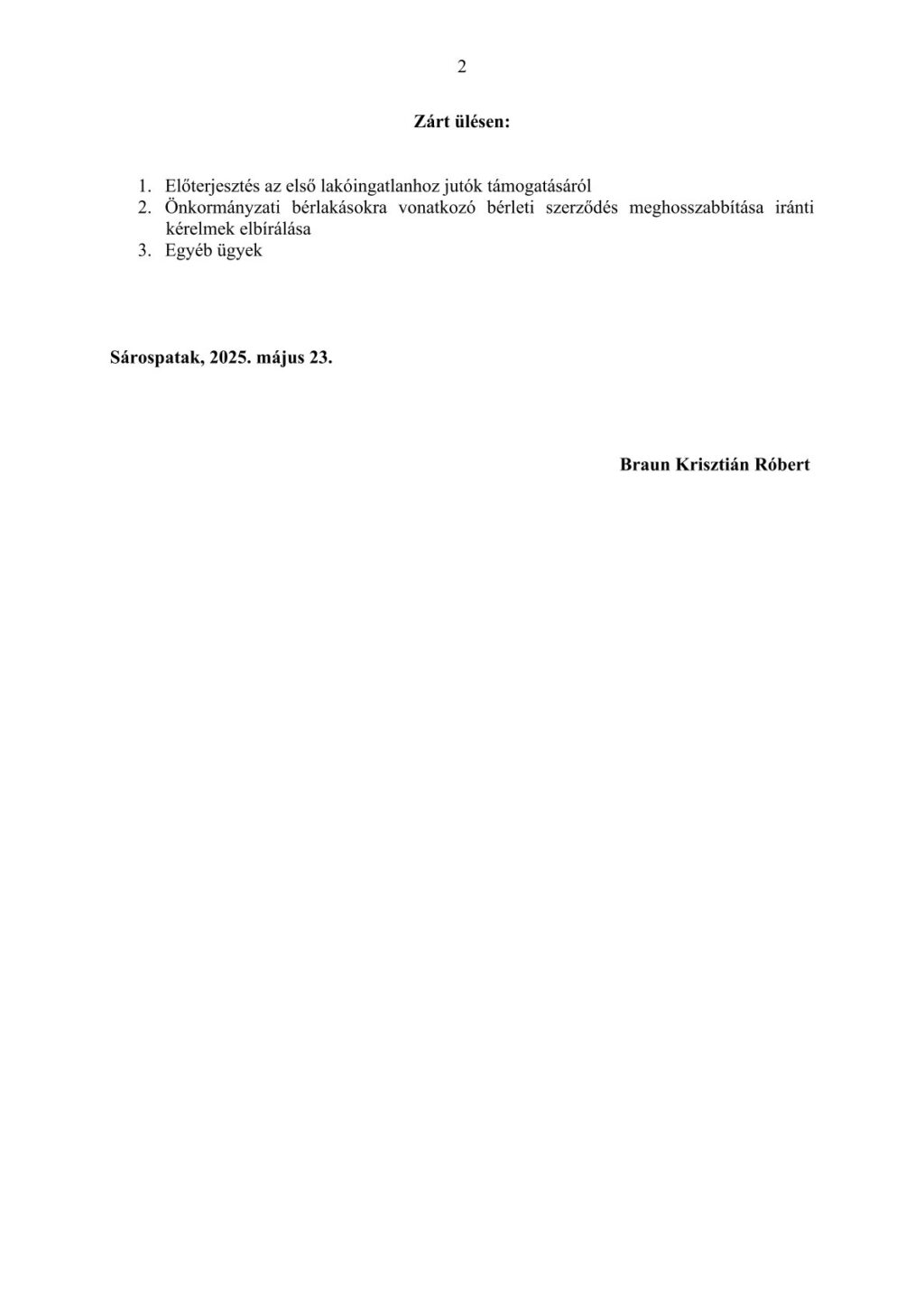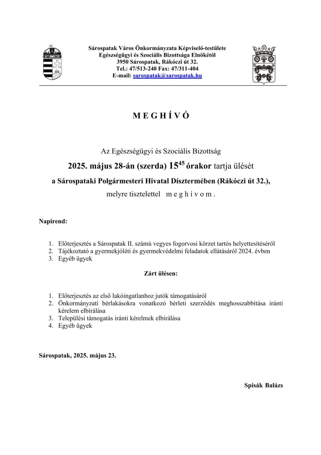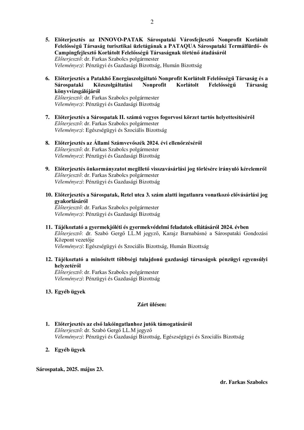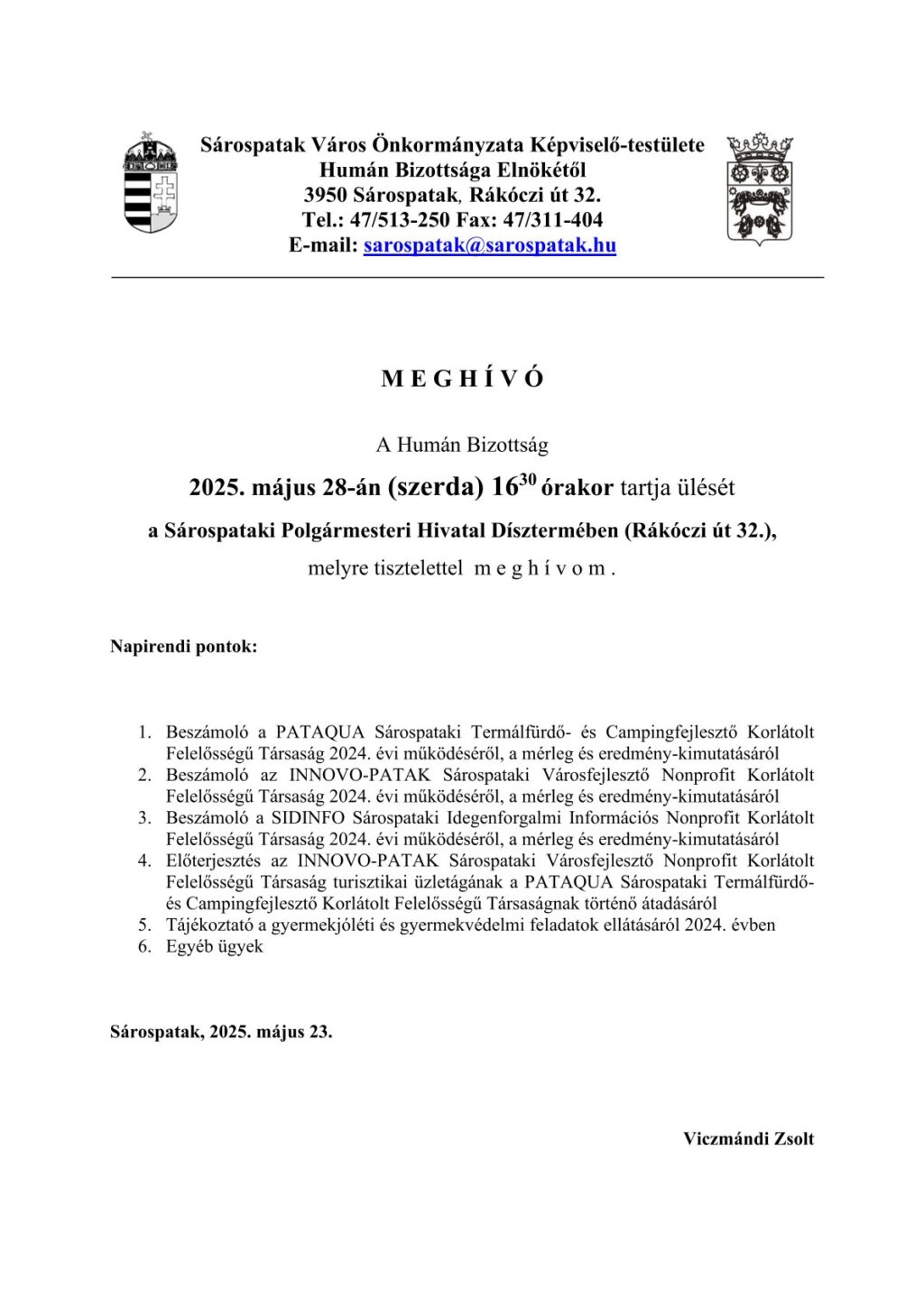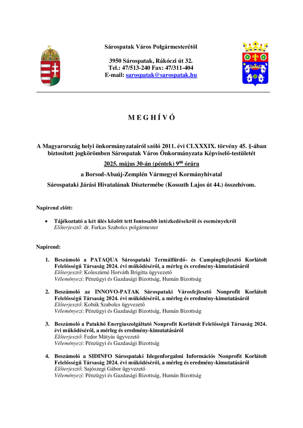 • MEGHÍVÓ 2025. május 30. KÉPVISELŐ TESTÜLETI ÜLÉS