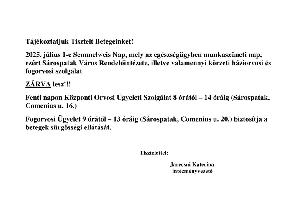 Tájékoztatás – 2025.06.26.-i sebészeti és traumatológiai szakrendelésről