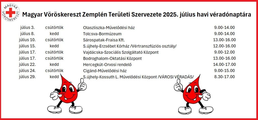 • MAGYAR VÖRÖSKERESZT 2025 JÚLIUS HAVI VÉRADÓNAPTÁRA
