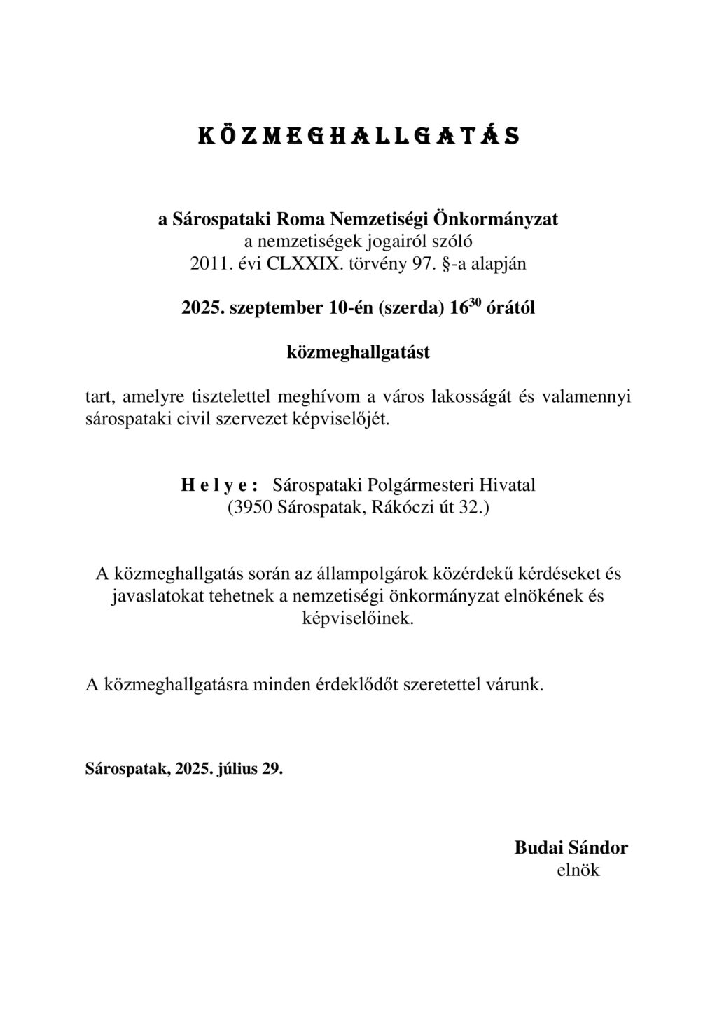 • Közmeghallgatást tart a Sárospataki Roma Nemzetiségi Önkormányzat