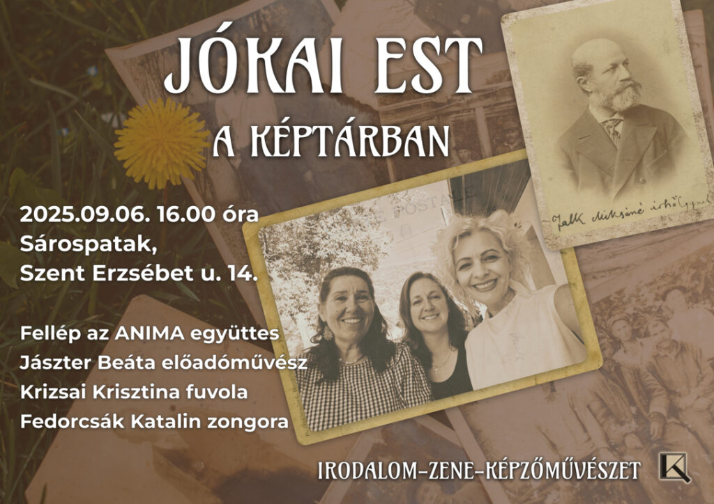 Szeretettel várjuk Önöket 2025. szeptember 6-án, 16.00 órától a Sárospataki Képtárba egy különleges kávéházi estre az Anima együttes közreműködésével. Jászter Beáta előadásában elevenedik meg Jókai Mór kalandos élete, melyet Krizsai Krisztina és Fedorcsák Katalin zenéje tesz teljessé. Bár Jókai születésének 200. évfordulóját ünnepeljük, ezen az estén olyan történeteket is hallhatnak, amelyek újat mondhatnak a jól ismert író alakjáról.