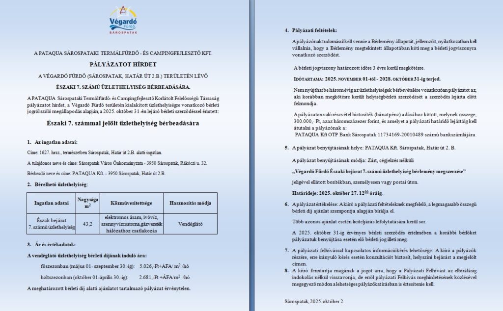 • VÉGARDÓ FÜRDŐ PÁLYÁZATOT HIRDET ÜZLETHELYSÉG BÉRBEADÁSÁRA