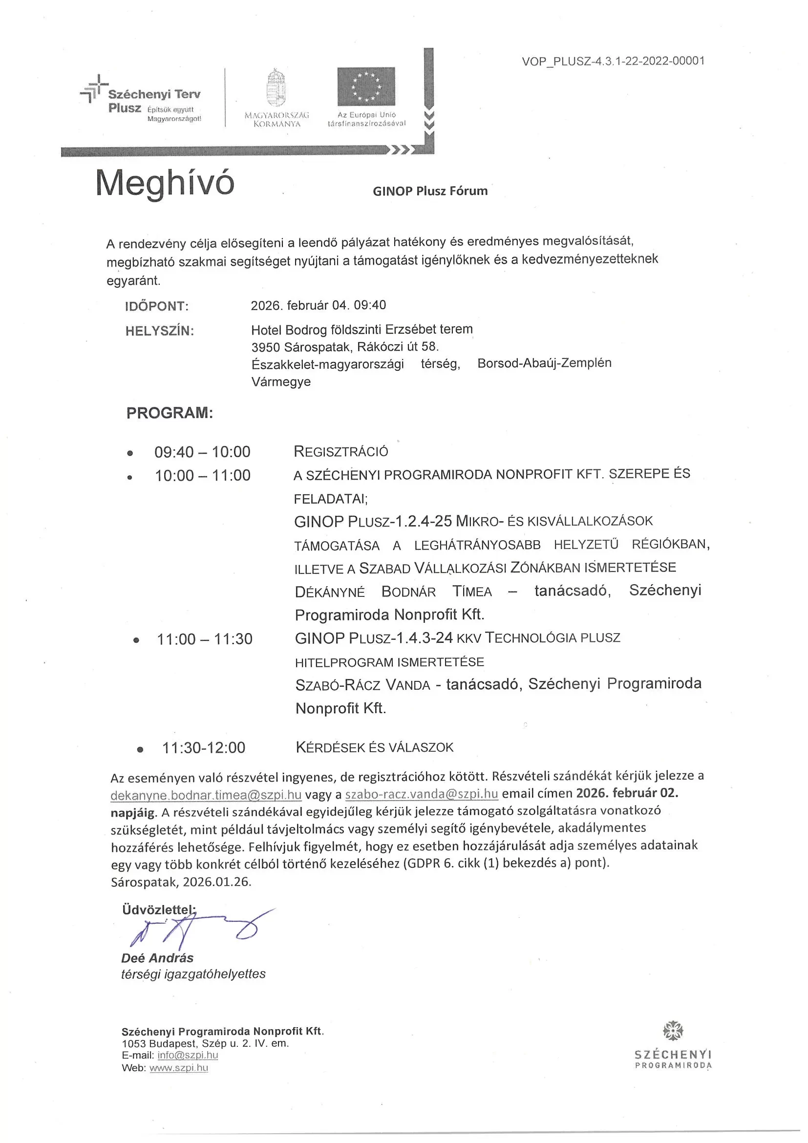 Ezúton tisztelettel tájékoztatjuk, hogy a Borsod-Abaúj-Zemplén Vármegyei Kereskedelmi és Iparkamara és a Széchenyi Programiroda közös szervezésében Vállalkozói Fórum kerül megrendezésre Sárospatakon, amelynek célja a térség mikro-, kis- és középvállalkozásainak tájékoztatása az aktuális és várható GINOP Plusz pályázati lehetőségekről, valamint a sikeres pályázati megvalósítást támogató szakmai segítség bemutatása.