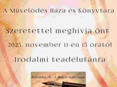 A Művelődés Háza és Könyvtára Irodalmi Teadélután – A Magyar Nyelv Napja alkalmából – (A Művelődés Házában) – 2025.11.11. 15:00 Tovább » 2025.11.05.